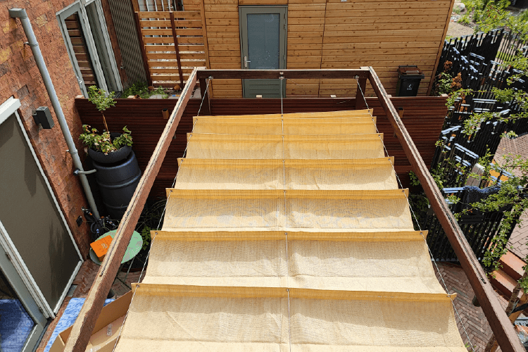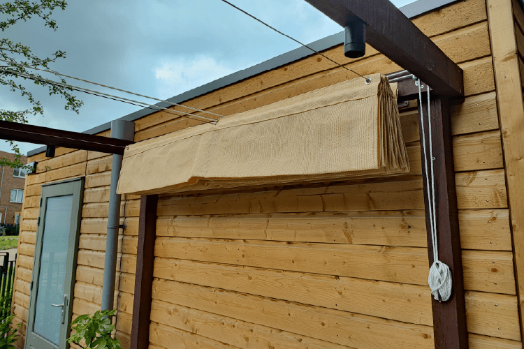 Boven het tegel terras hebben wij een pergola gemaakt van Azobé hardhout. Dit is een duurzame, degelijke pergola waar wij een prachtig harmonica schaduwdoek op maat in hebben gemaakt. Dit zorgt voor wat verkoeling in de hete zomer en is makkelijk op te bergen wanneer deze niet meer nodig is.