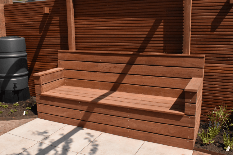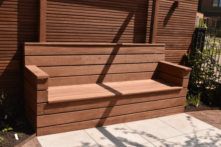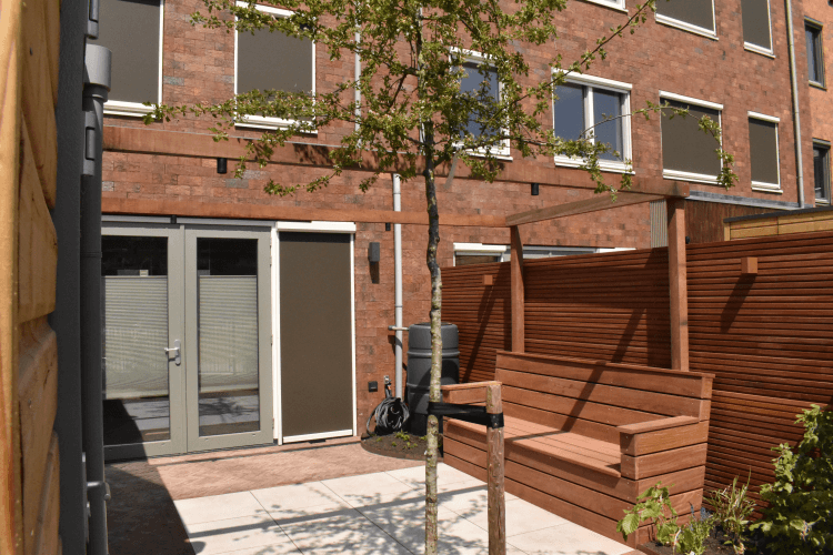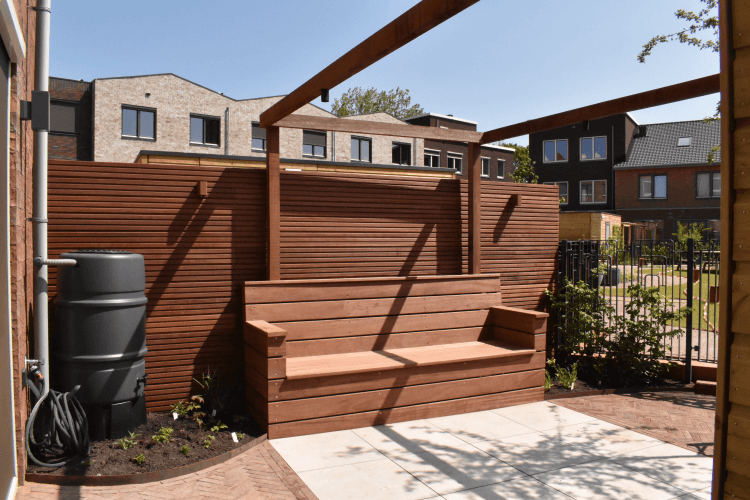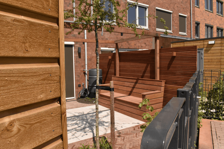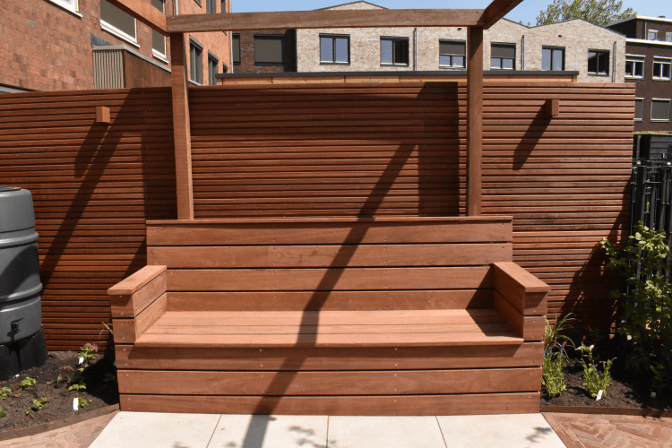 Voor deze afscheiding hebben wij een prachtige hardhouten bank op maat gemaakt. Deze bank zit vast in de grond en geheel gemaakt van Cumaru planken. Deze oplossing zorgt voor ruimte in zo’n kleine stadstuin.