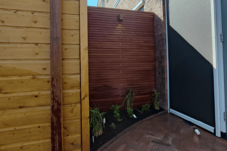 De tuin leeghalen hoefde niet. Dus wij konden gelijk beginnen met de prachtige afscheidingen. Deze afscheidingen zijn van hardhouten planken, Deens Rabat. Door de planken horizontaal te bevestigen, lijkt de tuin langer.