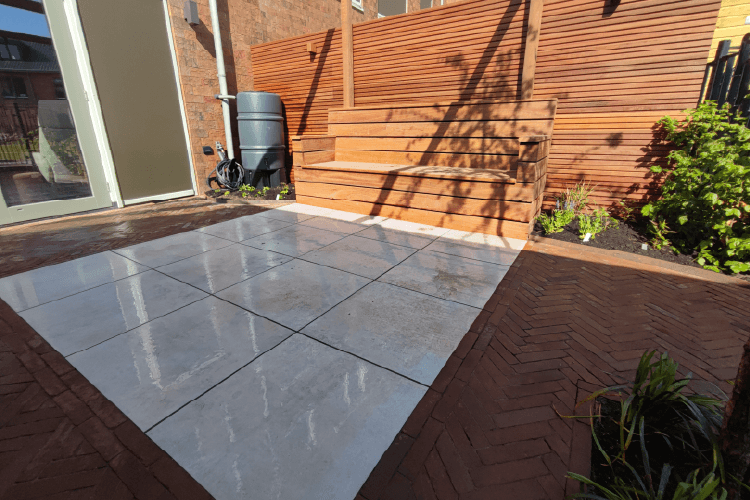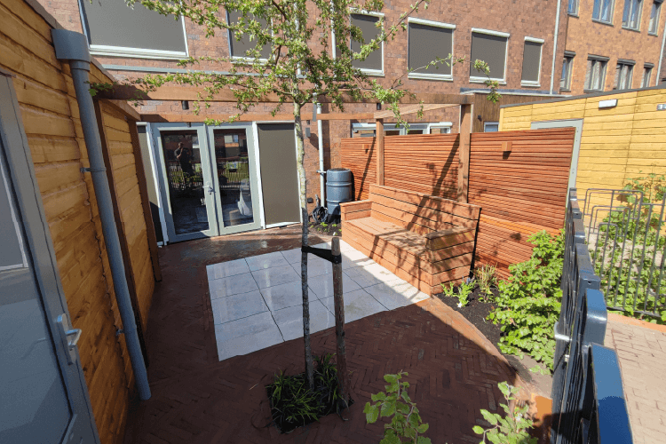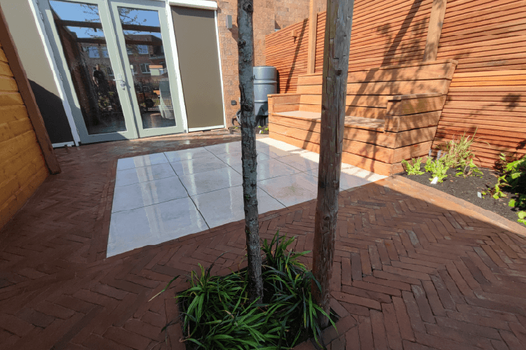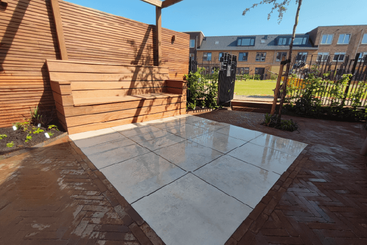 De verharding is een combinatie van gebakken klinkers, in visgraatverband en keramische tegels. Deze combinatie past heel goed bij elkaar. De bank is exact op de maat van het tegel terras gemaakt, zodat hier voldoende ruimte is voor een tafel en stoelen.